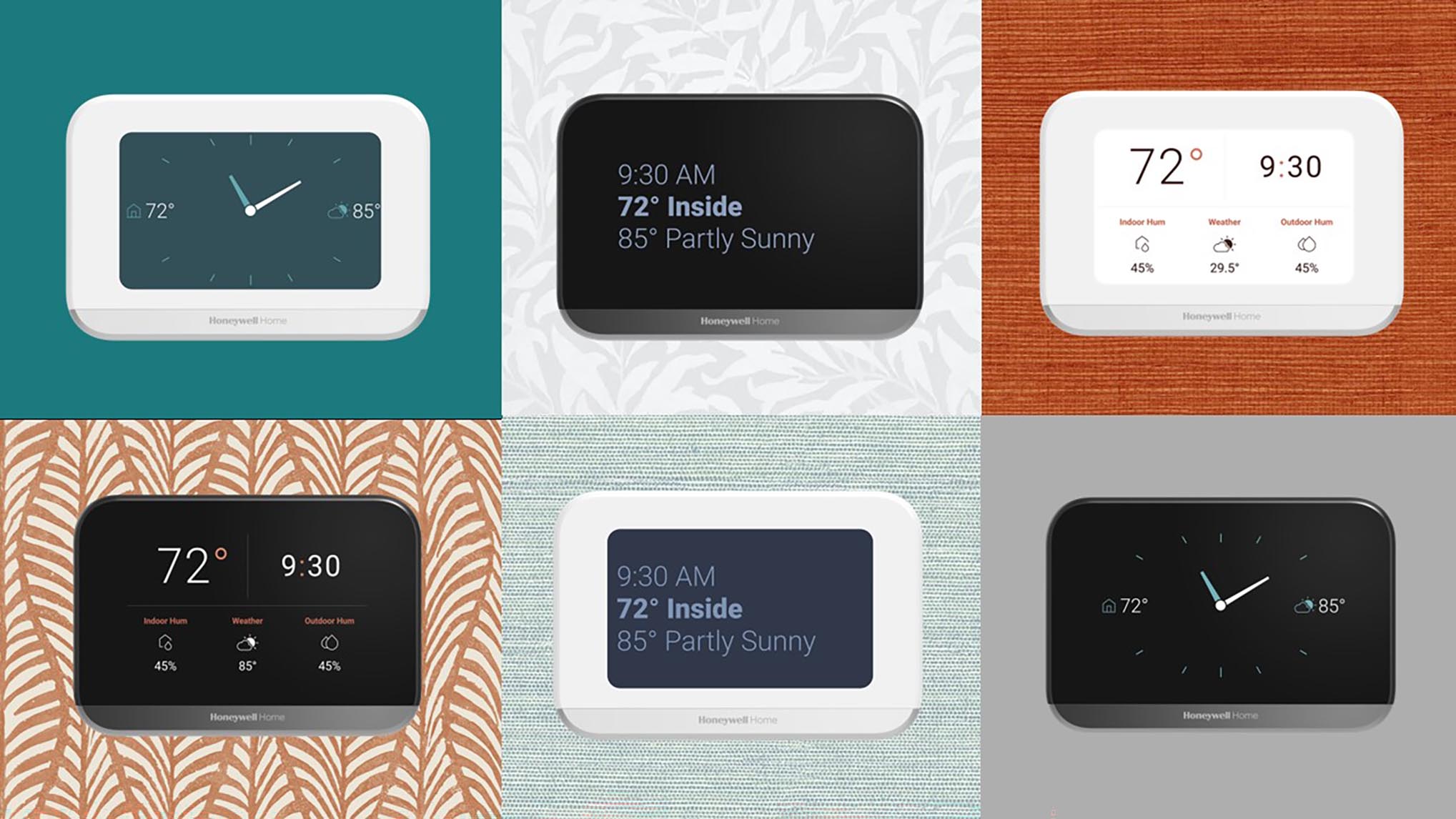 Current Setting; Current Temperature; Indoor Humidity; Outdoor Temperature; Thermostat Controls; Time; Down Arrow; Up Arrow. This smart home thermostat comes with a full-color, completely customizable idle screen to match your home's surrounding decor. The display features smart controls, daily forecasts, as well as customizable clock, and smart doorbell integration options.