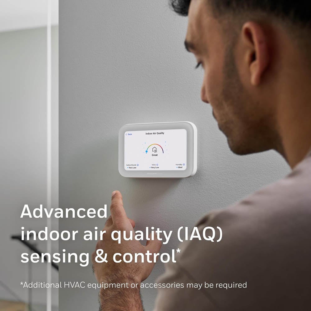 Smart Home Comfort. The Honeywell Home X8S Smart Thermostat combines convenience, comfort, and energy efficiency with advanced features to enhance your home living space. The sleek 5" touchscreen display delivers enhanced visibility with the option to choose the color and style of the idle screen to match your home. The X8S provides precision comfort and indoor air quality (IAQ) monitoring and control and can be adjusted remotely, along with other smart home Resideo video, safety, and water leak detection products, via the First Alert app.