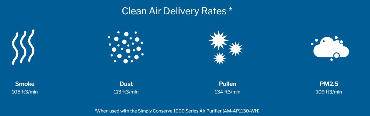 Smoke 105 ft3/min, Dust 113 ft3/min, Pollen 134 ft3/min, PM2.5 109 ft3/min.